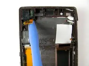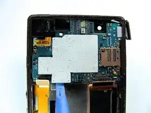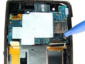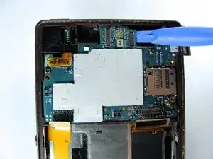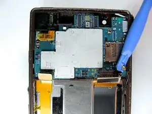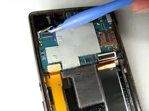 Пластиковым инструментом для вскрытия крепко подденьте материнскую плату и приподнимите её из корпуса телефона. Подденьте с правой стороны материнской платы, там где ранее располагалась задняя камера.