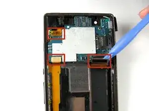 С помощью пластикового инструмента аккуратно оторвите красную ленту от материнской платы. Этот поп-разъем расположен в верхнем правом углу телефона.