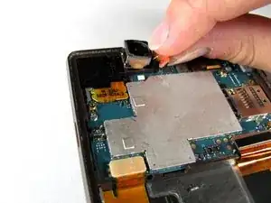 Освободите медную ленту, расположенную в верхней центральной части телефона, пластиковым инструментом. Потребуется усилие, так как клей довольно сильный.