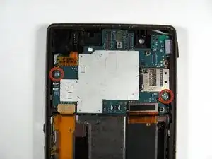 Удалите один винт 3 мм крестовой отверткой Phillips #000. Винт расположен в верхнем правом углу материнской платы. Материнская плата — это зеленая/серебристая печатная плата в верхней части телефона.