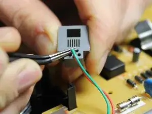 С помощью прецизионных пинцетов поднимите золотые концы зеленого и красного проводов вверх.