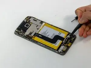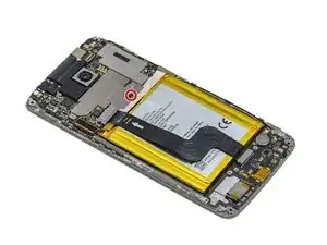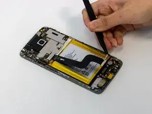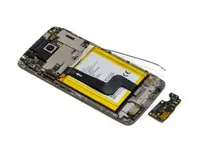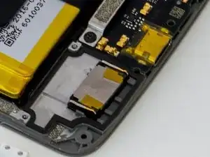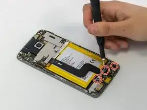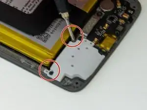 Используйте отвертку Phillips #00, чтобы удалить два винта по 2.0 мм, фиксирующие кронштейн рядом с нижней частью аккумулятора, и один винт по 2.0 мм рядом с мотором вибрации.