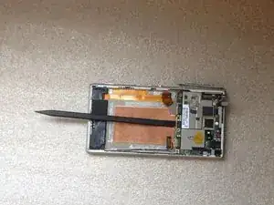 Вставьте пластиковую лопатку между логической платой и основной рамой.