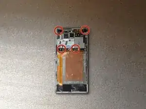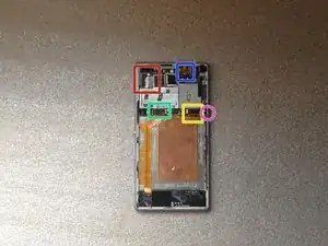 Батарея приклеена к рамке телефона. Используйте белую ленту, чтобы снять её.