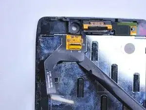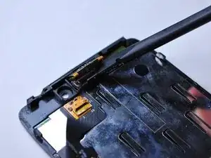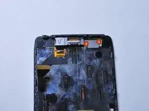 На тыльной стороне ЖК-дисплея отсоедините жёлтый ленточный шлейф фронтальной камеры, аккуратно приподняв вверх чёрную фиксатора лопаткой.