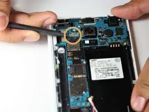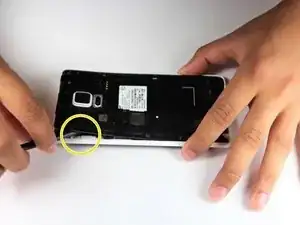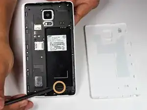 Используйте лопатку, чтобы снять заднюю крышку телефона, поддев её в выемке в верхнем левом углу телефона.