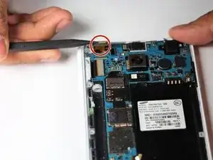 Остроконечным концом лопатки подденьте и отсоедините следующие разъёмы, соединяющие эти части с платой в верхнем левом углу: