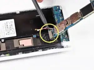 Остроконечным концом лопатки отсоедините два провода (розовый и белый), расположенные в нижней части телефона.