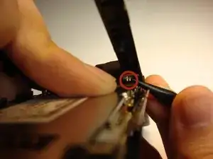 Пропустите этот шаг, если разъём дисплея уже отсоединён от материнской платы. С помощью лопатки вставьте заострённый конец между пластиковым концом проводника и гнездом на материнской плате, затем аккуратно приподнимите или сдвиньте проводник, чтобы отсоединить его. Вы должны увидеть два золотистых контакта, выступающих из пластикового разъёма.