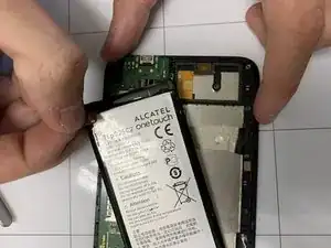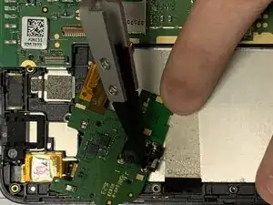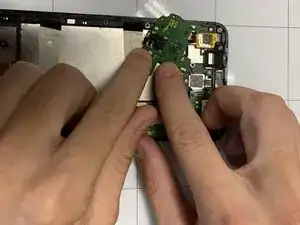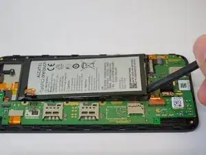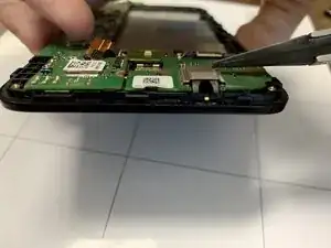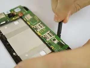 Вставьте плоский инструмент по краю телефона и аккуратно приподнимите, чтобы извлечь материнскую плату.