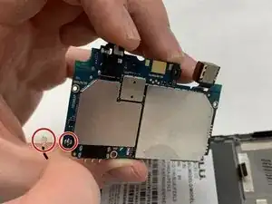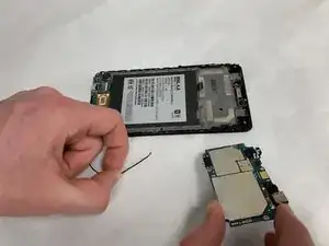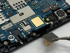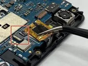 Материнская плата теперь должна освободиться от крепления в телефоне, но она всё ещё подключена к кабелю печатной платы. Чтобы отсоединить кабель от материнской платы, аккуратно подденьте его вверх.