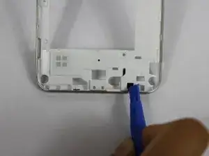 Используя пластиковый инструмент для вскрытия, снимите удлинитель антенны с средней рамки.