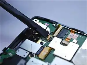 С помощью лопатки отожмите ленточный шлейф на крышке разъёма для наушников, надавив на место соединения.