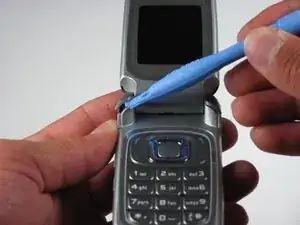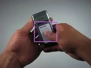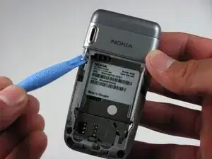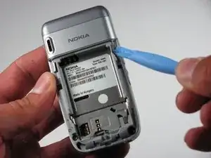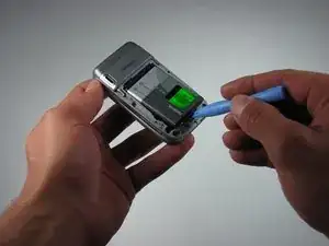 Вставьте инструмент для вскрытия iPod между основанием телефона и аккумулятором.