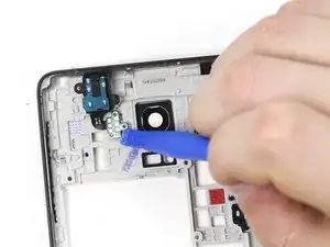Если новая средняя рамка не поставляется с узлом разъёма для наушников, вам потребуется пересадить его из старой рамки в новую. Его можно поддеть пластиковыми инструментами, так как он зафиксирован несколькими пластиковыми штифтами.