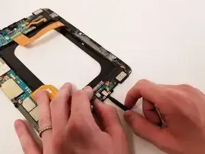 Найдите шлейф, идущий от средней рамы, и отсоедините его от материнской платы плоским концом лопатки.