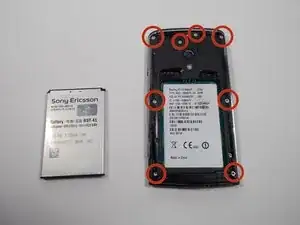 Начните с того, что экран телефона оказывается вниз, и извлеките батарею. Уберите восемь винтов по 5 мм, расположенных, как показано, с помощью битой T-6.