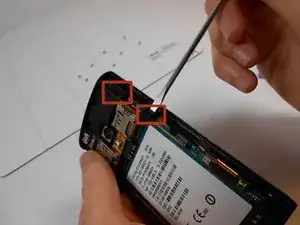 Используя лопатку, начните с правого нижнего угла телефона и отсоедините зажимы, расположенные на внутренних сторонах. Повторите этот шаг для левой стороны.