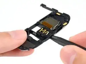 Вставьте лопаточку под ручку узла разъёма для наушников/динамика и подденьте его вверх из его посадочного места.