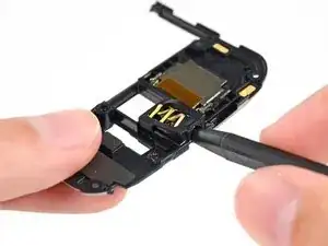 Используйте наконечник лопатки, чтобы откинуть фиксирующую защёлку на ZIF-разъёме кабеля вспышки.