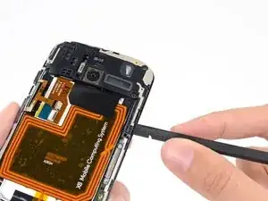 Есть шанс, что катушка NFC останется прочно приклеенной к задней крышке. В этом случае прекратите отгибать крышку и снова приложите нагретый iOpener к задней крышке.