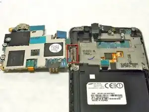 Материнская плата всё ещё будет соединена с корпусом телефона ленточным кабелем кнопки питания, который приклеен.