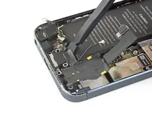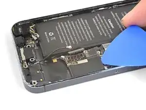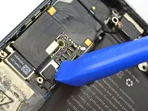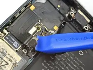 Воспользуйтесь вскрывающим инструментом, чтобы поддеть и отключить кабель разъёма Lightning от гнезда на плате.