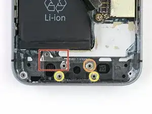 Под узлом разъёма Lightning на стойках винтов расположены несколько промежуточных распорок. Хотя они не критичны для работы телефона, при сборке следует вернуть эти шайбы туда, где вы их нашли. Распорки могут различаться между устройствами; в этом устройстве имеются распорки следующего вида: