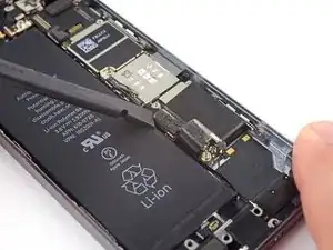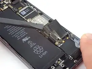 Снимите металлический кронштейн разъёма аккумулятора с iPhone.