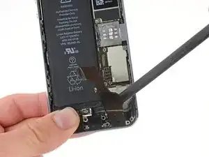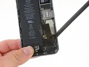 Используйте лопатку, чтобы поддеть кабель разъёма Lightning из его гнезда на логической плате.