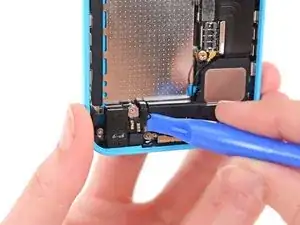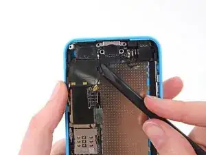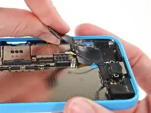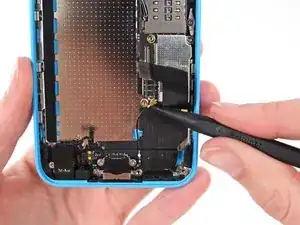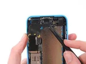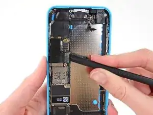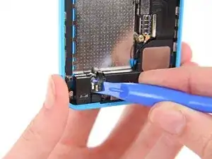 Кабель разъёма Lightning слегка приклеен к экрану на плате. Используйте плоский конец лопатки, чтобы аккуратно отслоить кабель.