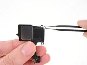 В крайнем правом отверстии для винта на динамике имеется прижимная планка контакта, обёрнутая вокруг него. Эта небольшая деталь может неожиданно отвалиться, поэтому лучше снять её и запомнить ориентацию для повторной сборки.