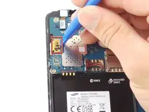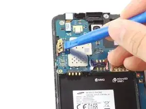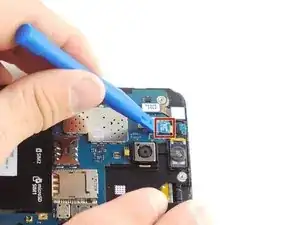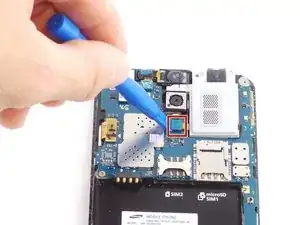 Снимите заднюю крышку телефона, поддев её за выступ синим пластиковым инструментом.
