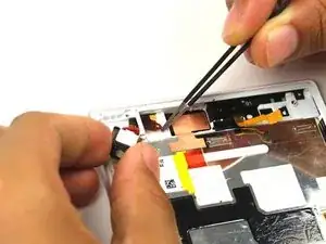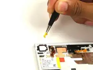 Снимите жёлтую защёлку, фиксирующую слот разъёма наушников, пинцетом.