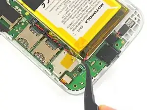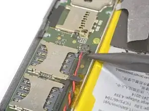 Чтобы установить батарею, ориентируйте новую батарею так, чтобы провода выходили вблизи нижней части телефона, а разъём батареи находился со стороны материнской платы.