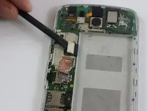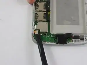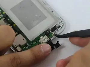 С помощью пинцета поднимите чёрную силиконовую деталь, соединяющую материнскую плату с фронтальной панелью.