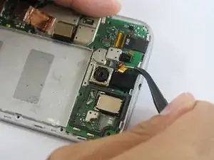 С помощью пинцета снимите жёлтую плёнку, соединяющую заднюю камеру с материнской платой.