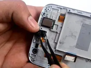 С помощью пинцета поднимите чёрную силиконовую деталь, покрывающую аудиоразъём.