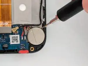 Используйте лопатку, чтобы отодрать кнопку-элемент питания рядом с местом, где был золотой провод.