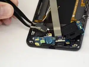 С помощью пинцета аккуратно снимите мотор вибрации и остальную часть платы зарядного разъёма.