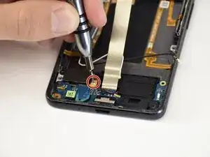 Отклейте небольшой кусочек ленты, накрывающей винт под разговорным динамиком. Отклейте также любую ленту, закрывающую другие винты.