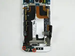 Используя отвёртку Phillips #00, открутите два 1-мм винта в правом нижнем углу материнской платы, которые фиксируют разъём питания.