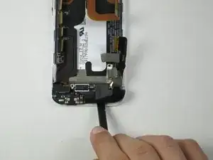 Используя острый конец лопатки, потяните провода вибромотора влево, чтобы извлечь разъём из платы.