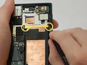 Отключите два золотых разъёма от материнской платы с помощью лопатки.