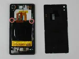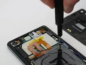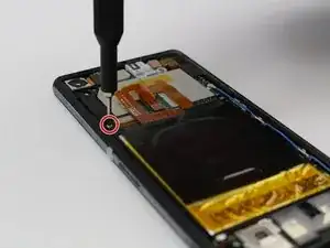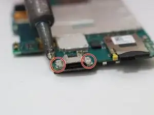 Используйте отвёртку T5 Torx, чтобы вывернуть два винта на длинной металлической скобе, расположенной с левой стороны телефона.