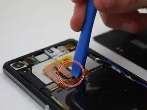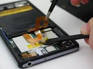 Медленно подденьте гибкий оранжевый кабель лопаткой в форме алафака, чтобы аккуратно отклеить его приклеенную часть от корпуса телефона.