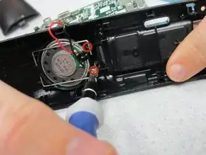 Открутите два винта (размер головки: 4 мм, длина: 8,6 мм) на нижней части корпуса, удерживающие фиксатор динамика на месте.