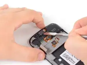 Используйте плоский конец металлической лопатки, чтобы извлечь динамик из гнезда в сборке переднего дисплея.