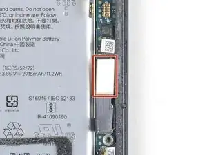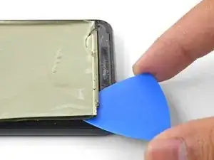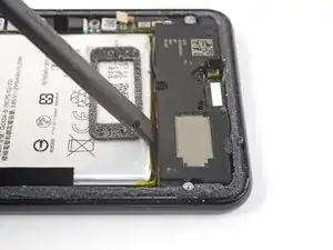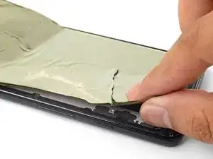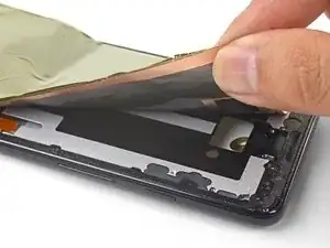 Используйте плоский конец лопатки, чтобы осторожно приподнять чёрную ленту, удерживающую шлейф дисплея на месте, возле правого края телефона.