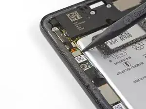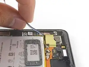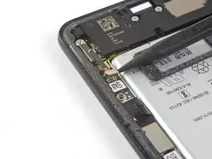 Используйте острый конец лопатки, чтобы приподнять и отключить пресс-коннектор батареи от его разъёма возле правого края телефона.